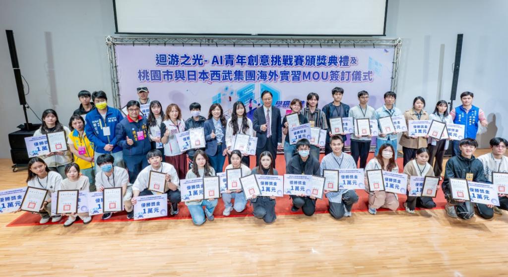 【大成報記者袁慧心/桃園報導】桃園市長張善政今(24)日下午前往市立圖書館,出席「洄游之光-AI青年創意挑戰賽頒獎典禮及桃園市與日本西武集團海外實習MOU簽訂儀式」。張市長表示,實習是青年瞭解產業運作與探索職涯方向的重要管道,市府期待透過跨國合作,使學生能在不同文化與產業環境中汲取經驗,深化國際視野。今日與西武集團正式締結合作,象徵桃園青年實習機會已走向國際,未來市府也將持續拓展更多海外合作對象,協助青年在全球舞台上展現實力。