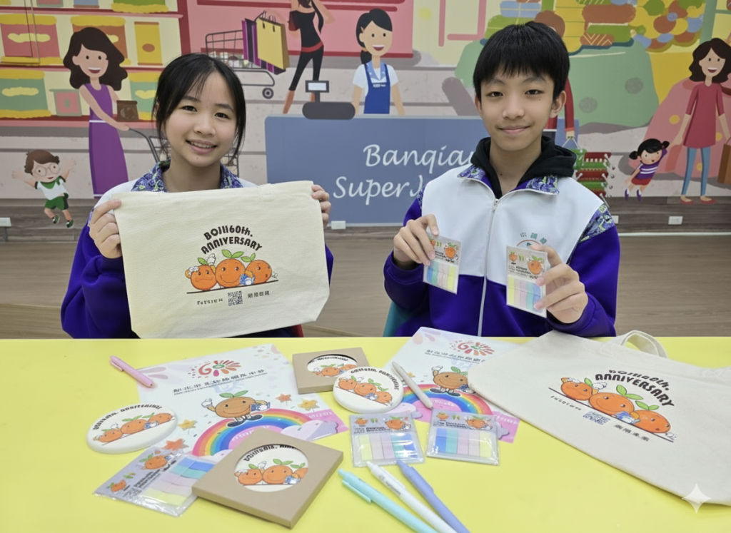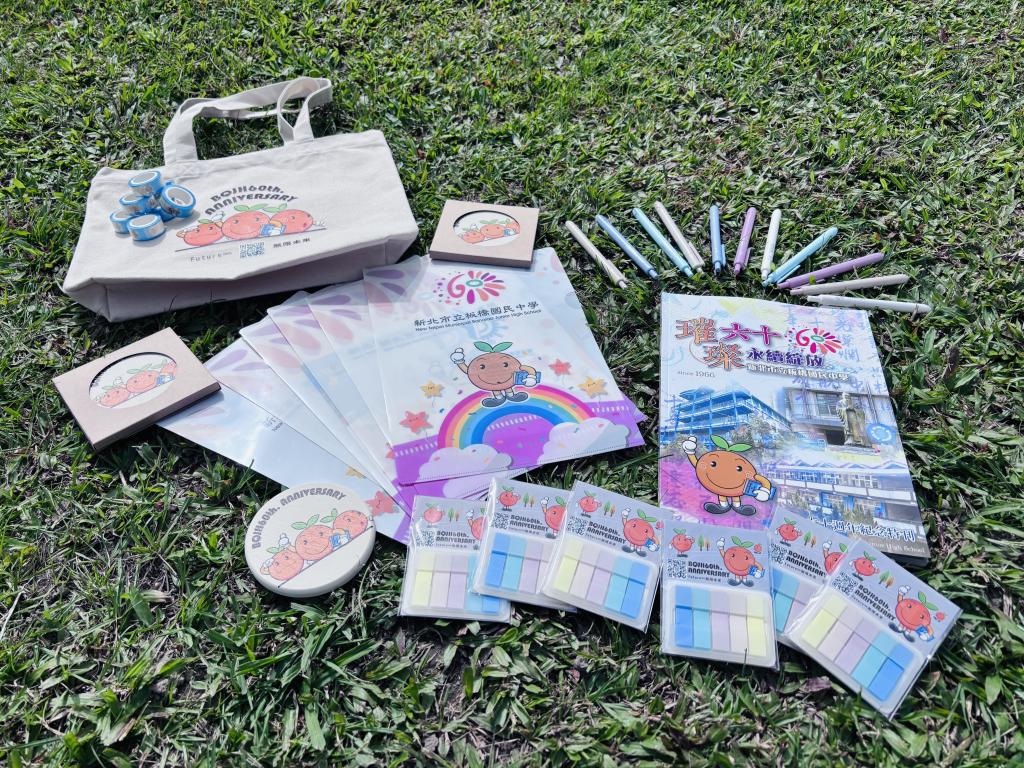 圖說:板橋國中60周年校慶紀念品多元豐富,包含紀念袋、紀念徽章、各式文具品等。