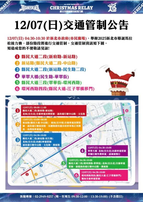交通局交通安全科代理科長李淑惠表示,今年耶誕馬拉松接力賽路線行經縣民大道二段→華翠大橋(上橋) →華翠街左迴轉下橋→左轉縣民大道三段→江子翠橫移門→河濱公園內→江子翠橫移門→右轉縣民大道三段→華翠街右迴轉上橋,最終返回市民廣場。為維護跑者及用路人安全,活動期間將實施下列交通管制措施,請民眾提前改道行駛。