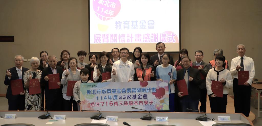 (大成報記者張玉玲/新北報導)新北市教育局今(11)日舉辦「教育基金會展臂關懷計畫感謝儀式」,感謝今年共有33家教育基金會投入教育公益,捐助「新北市溫馨助學圓夢基金」及多項教育計畫,年度總金額達716萬元。教育局長張明文親頒感謝狀,肯定各基金會的長期投入,讓跨界公益成為支撐弱勢學子前進的力量。