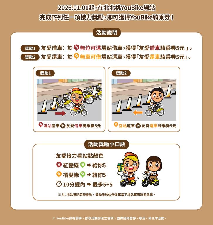 (大成報記者張玉玲/新北報導)北北桃3市將於明(115)年元旦同步推出「YouBike 2.0友愛接力」試辦計畫。新北市交通局表示,YouBike會員只要從無位(滿站)場站借出YouBike 2.0自行車,或將2.0自行車歸還至無車(空站)場站,即可獲得每次5元的騎乘券,10分鐘內最多可獲得2次獎勵,讓下一位使用者更容易借到車、停得到車,共同打造友善共享的騎乘文化。