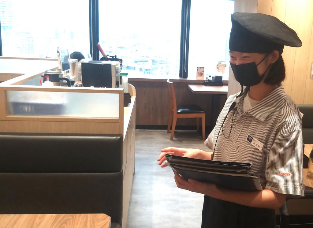 圖說:建教生許芝羽於職場訓練服務客人。