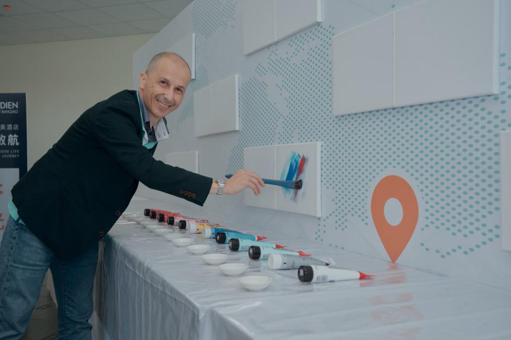▲板橋馥華艾美酒店總經理康傑男示範酒店推出的藝文活動。