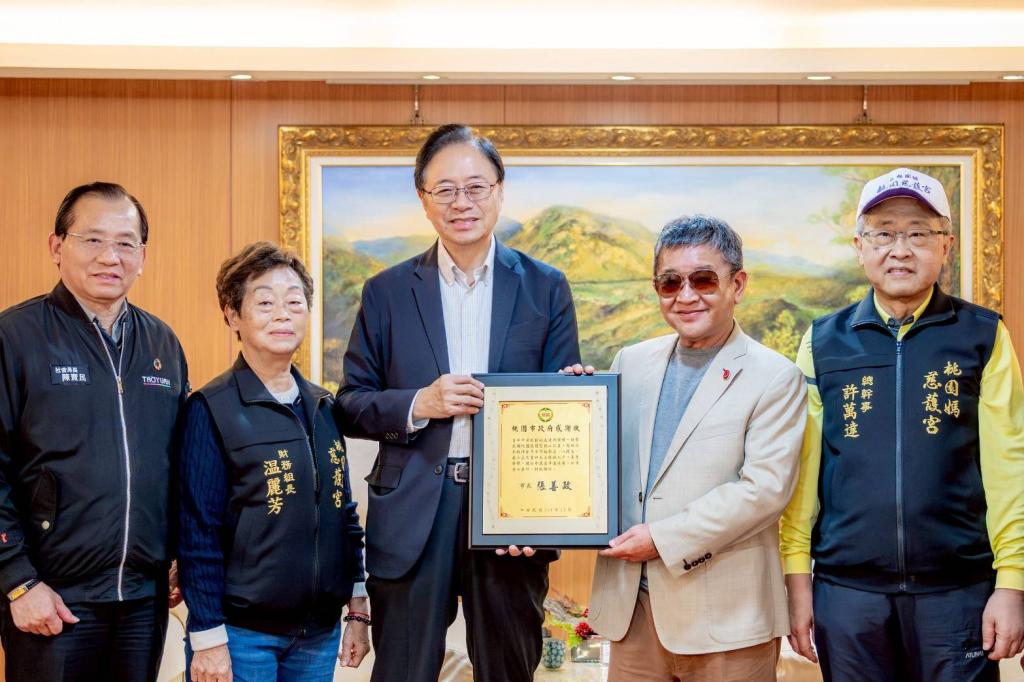【大成報記者袁慧心/桃園報導】桃園市長張善政今(19)日下午於市府貴賓室,出席「桃園慈護宮捐贈冬令救濟金儀式」,代表市府接受善款並致贈感謝狀,感謝慈護宮長年秉持濟世助人的精神,持續投入公益、關懷弱勢。宗教團體是社會重要的安定力量,市府將妥善運用本次捐贈款項,協助有實際需要的弱勢家戶度過寒冬,並持續強化桃園社會安全網,讓溫暖在城市中不斷傳遞。