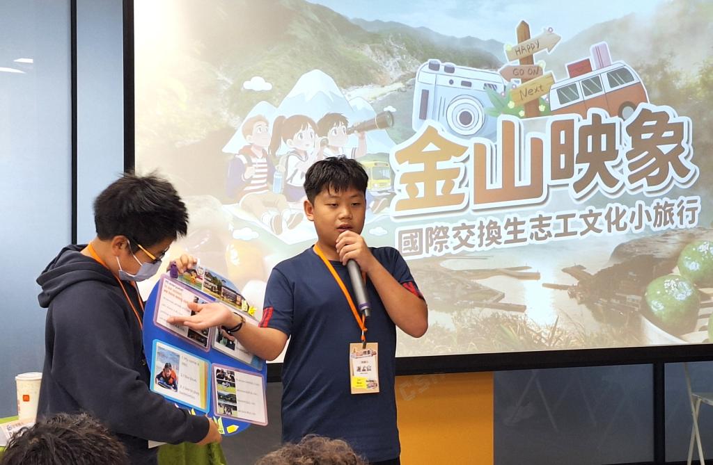 圖說:三和國小謝孟宸同學(右)以華語及英語穿插向國際學生介紹校園及金山特色。