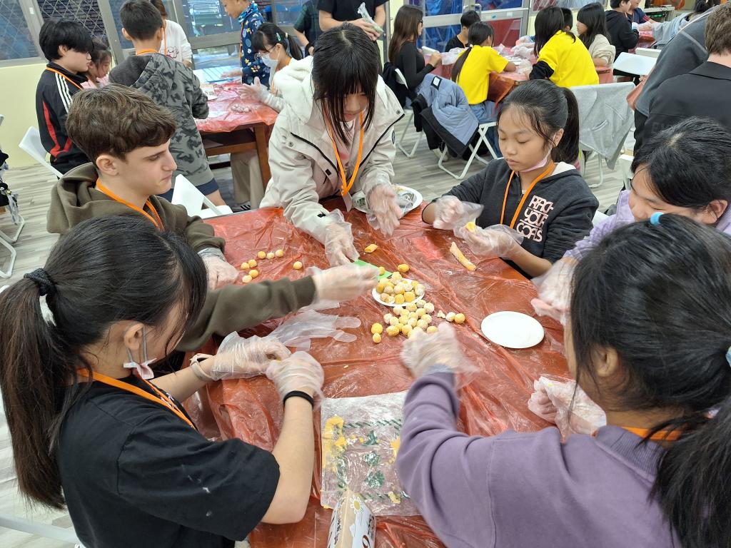 圖說:美國國際學生呂伊萊(左排第2位)在金山區學生的教學及示範下體驗手作芋圓。