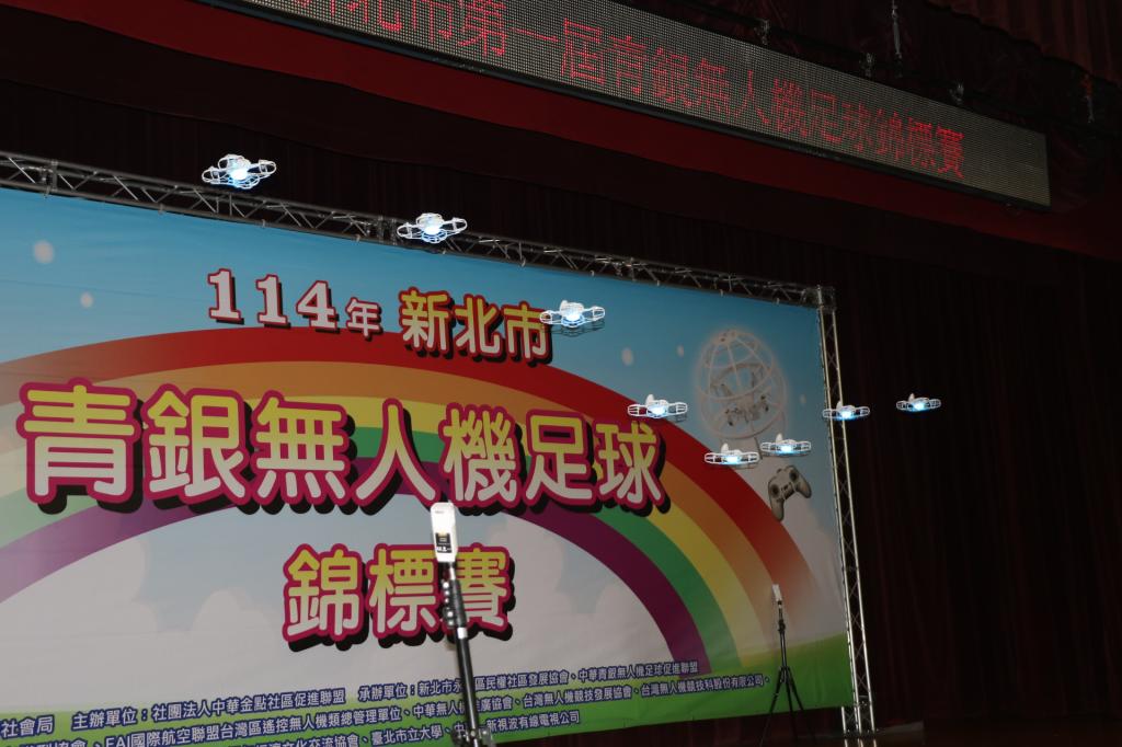 新北市首屆「銀髮x青年共創未來」無人機足球種子教練培訓成果展,現場共有 14 組由銀髮長輩與青年志工組成的聯隊同場競技,展現「活到老、玩到老、學到老」的共融精神。