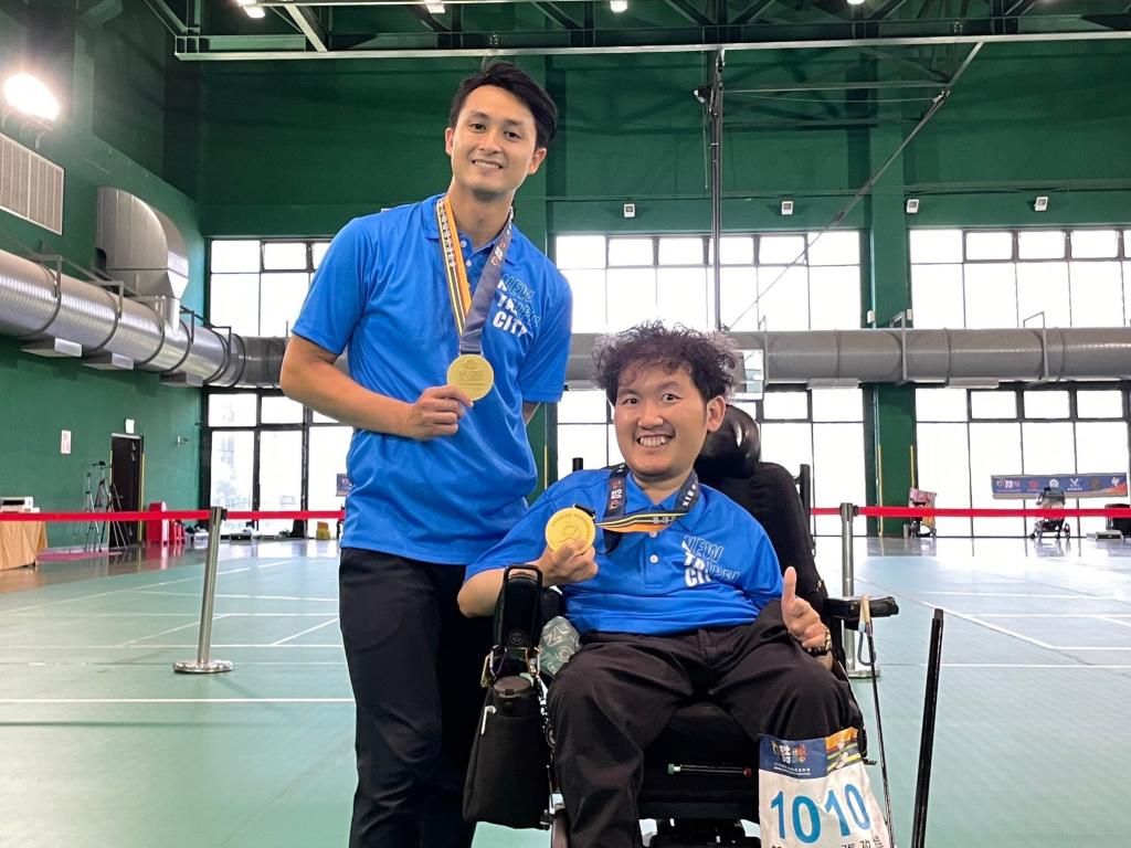 圖說:張孜維(右)與教練胡家榮合作 在111年摘下全國身心障礙國民運動會地板滾球賽的金牌。