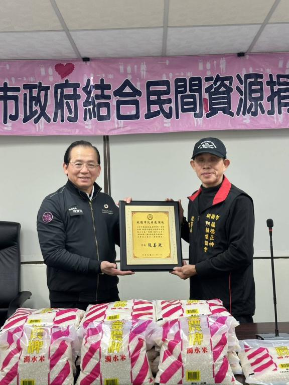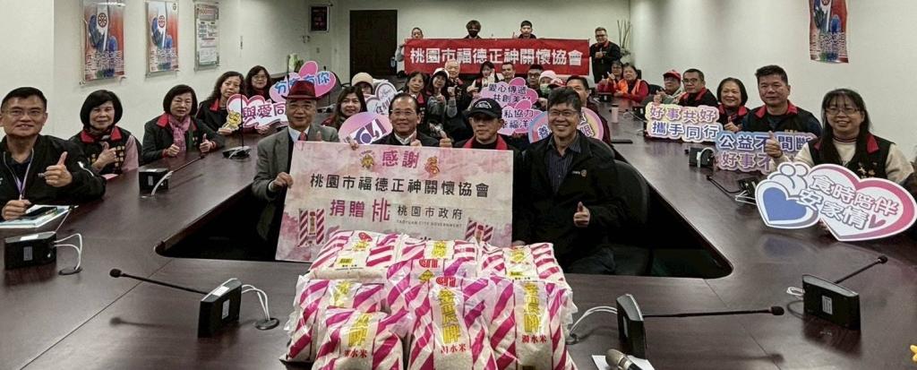 【大成報記者袁慧心/桃園報導】桃園市福德正神關懷協會捐贈1萬斤白米予本市弱勢家戶,115年1月9日下午於桃園市政府8樓會議室舉辦捐贈儀式,並由社會局陳寶民局長代表致贈感謝牌表彰善舉。