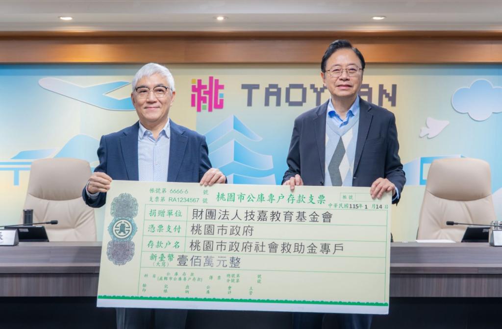 圖說:張市長感謝財團法人技嘉教育基金會捐贈新臺幣100萬元至桃園市社會救助金專戶。(圖/市府提供)