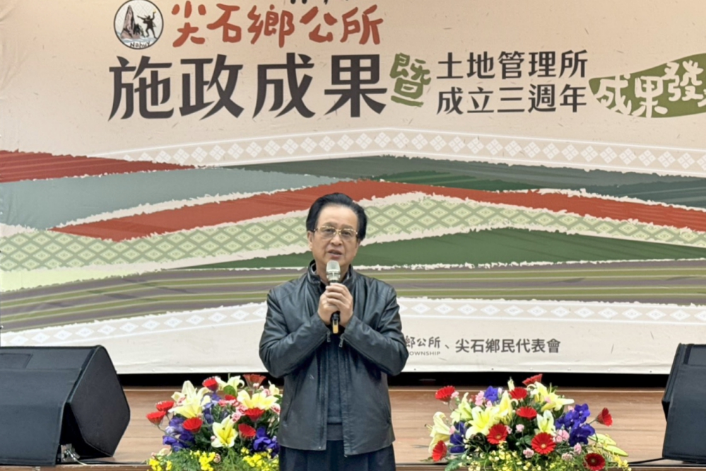 ▲竹縣尖石鄉公所盛大舉辦「新竹縣尖石鄉公所114年施政成果暨土地管理所成立三周年成果發表會」活動,竹縣府原民處長雲天寶致詞讚揚尖石鄉長曾國大任內的建設。