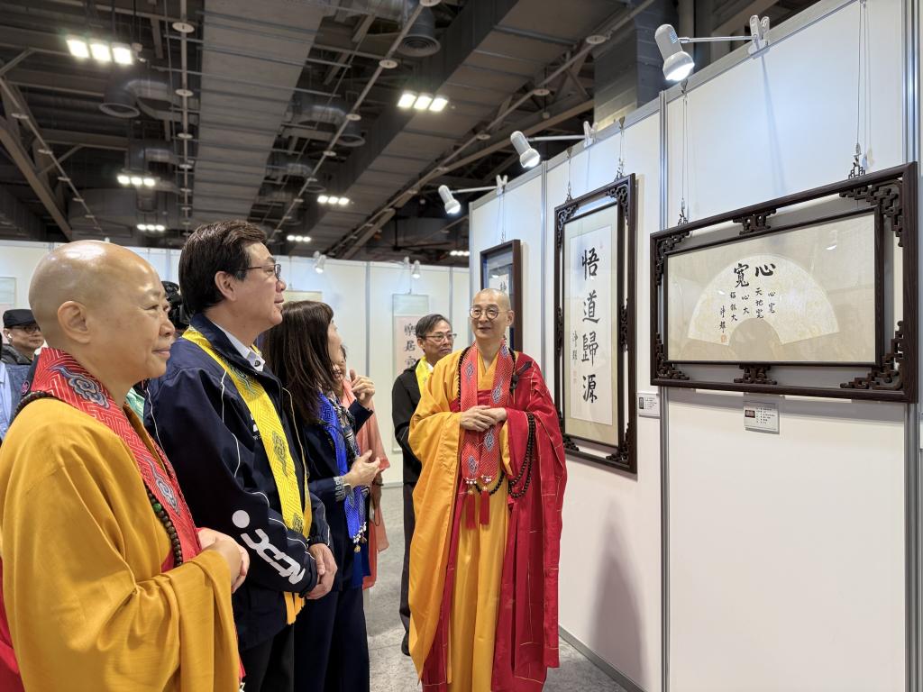 圖說:劉和然在淨化社會文教基金會董事長陳立純及慈法禪寺住持開善法師的帶領下,參觀淨耀大和尚墨寶展。