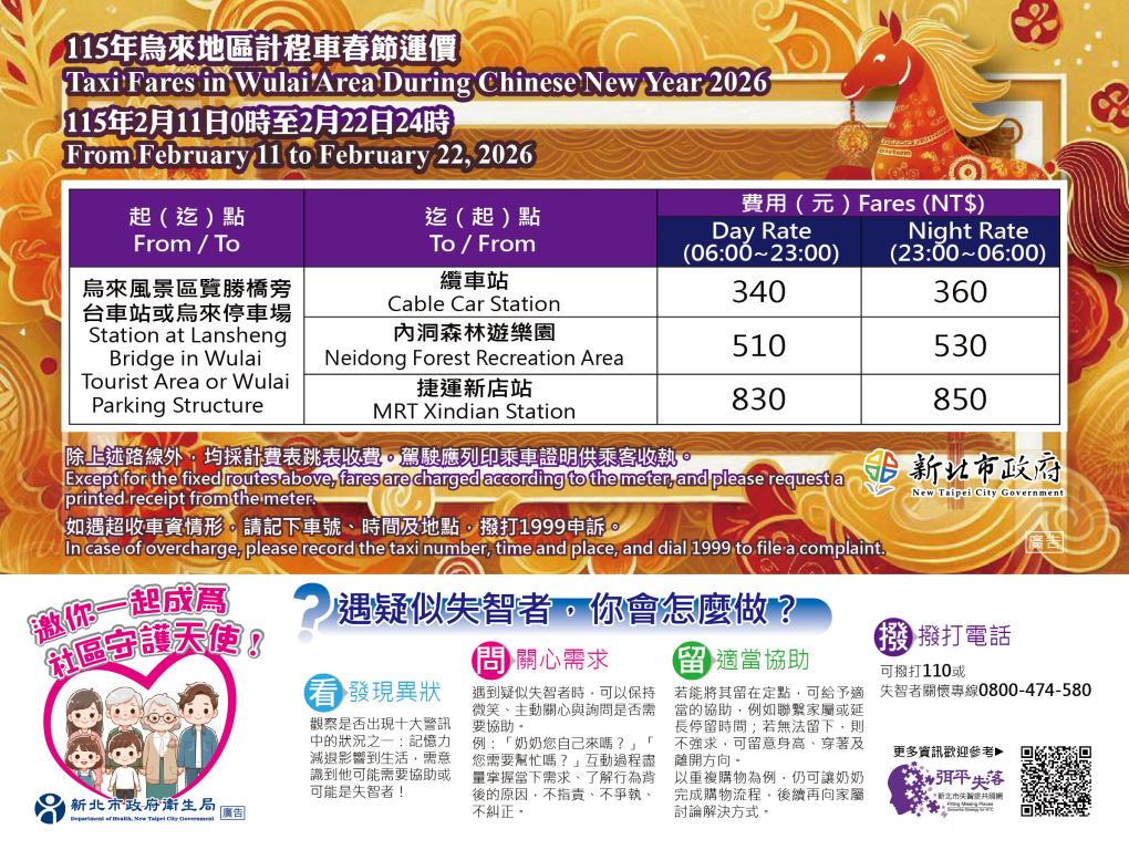 (大成報記者張玉玲/新北報導)115年新北市計程車春節加成收費,將自春節連假前3天起實施,即自2月11日(三)0時起至2月22日(日)24時止,共計12天。春節加成30元已納入跳表金額,並與臺北市、基隆市同步實施,請搭車民眾依跳表金額支付車資;瑞芳及烏來地區固定路線則依現場公告之春節運價收費。