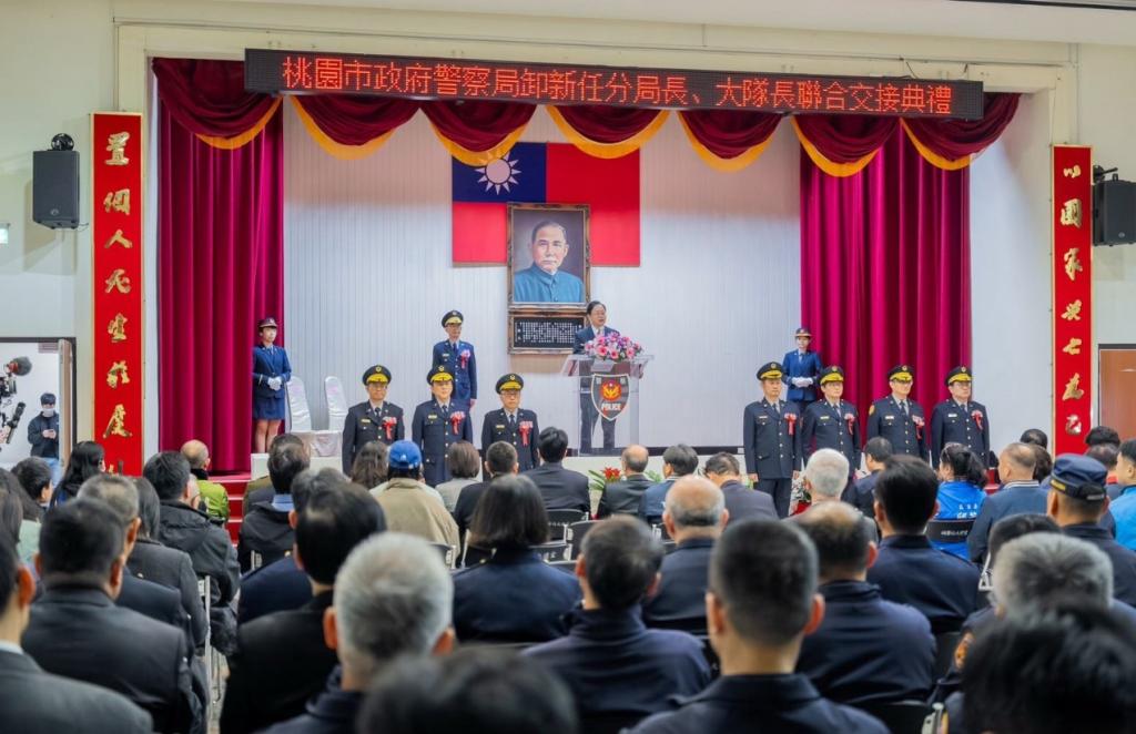 【大成報記者袁慧心/桃園報導】桃園市長張善政今(20)日下午前往市府警察局,出席「桃園市警察局卸新任分局長、大隊長聯合交接典禮」。張市長期勉新任警政同仁能憑藉豐富經驗,持續提升治安作為,為市民打造安定宜居城市。