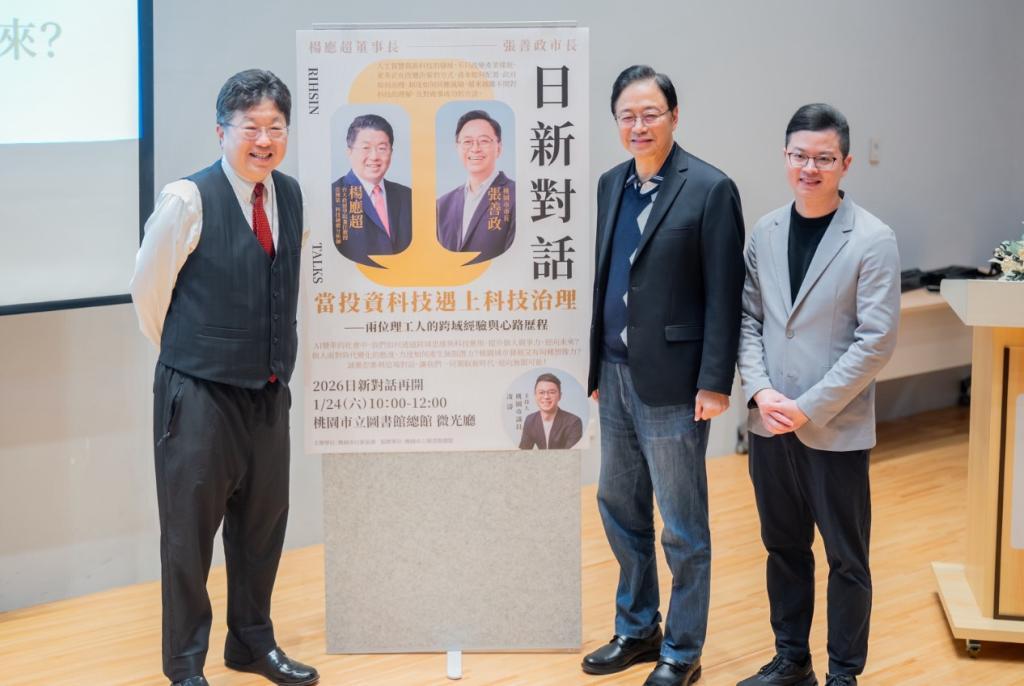 【大成報記者袁慧心/桃園報導】桃園市長張善政今(24)日上午出席桃園市日新協會「日新對話:當投資科技遇上科技治理」座談,與台大政經學院兼任教授楊應超以及發起人凌濤對談。