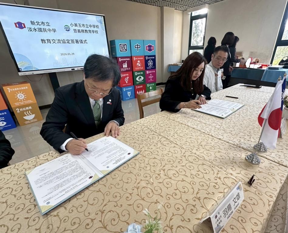 簽約儀式在新北市教育局副局長劉明超與日本小美玉市副市長深谷一広(Fukaya Kazuhiro)共同見證下,由淡水國中校長王潔雯與小美玉市教育長羽鳥文雄(Hatori Fumio)代表簽署,象徵淡水區與小美玉巿從城巿友好關係,正式向下扎根,開展校園層級的深度合作。