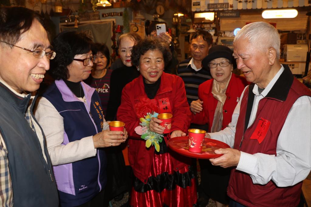 (大成報記者張玉玲/新北報導)「深山內迎花轎/鼓吹八音玲瓏叫/內山的姑娘呀/坐轎要出嫁喲…」位於板橋中山路二段光仁中學校門巷內小兔子照顧關懷據點,5日中午傳來鞭炮聲,原來據點內一對高齡長輩,在歷經2年多同窗情誼,及一場突來襲來的生死考驗,兩人決定廝守終身。社會局副局長許秀能受邀為這對老新人見證,並祝福他們彼此相互照顧扶持,繼續在據點上課。所有在據點的長輩也一起分享幸福,品嘗據點準備的甜茶和喜餅。