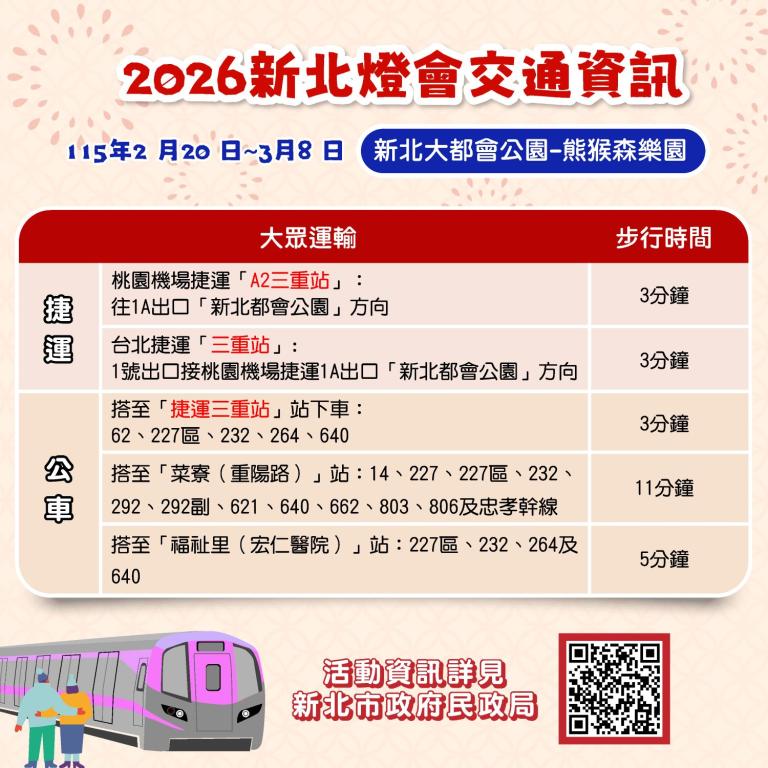 另2026新北燈會將於2月20日至3月8日在新北大都會公園舉行,民眾可搭乘臺北捷運中和新蘆線或桃園機場捷運搭乘至「三重站」,再步行約3分鐘即可抵達會場,再次提醒大家多加利用捷運及公車前往賞燈,省去尋找停車位的麻煩。