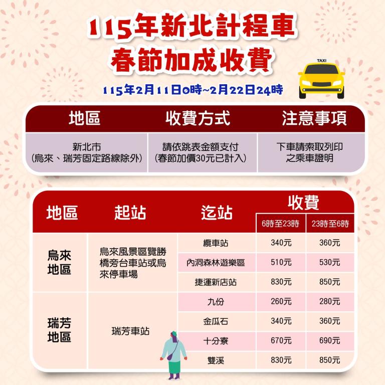 交通局提醒,新北市計程車春節加成收費將自春節連假前3天起,即自2月11日(三)0時起至2月22日(日)24時止共計12天,與北市、基隆同步實施,春節加收30元已計入跳表,請搭車民眾依跳表金額支付車資,並可於下車前索取乘車證明,當場確認收費金額;瑞芳及烏來地區固定路線則依現場公告春節運價收費。