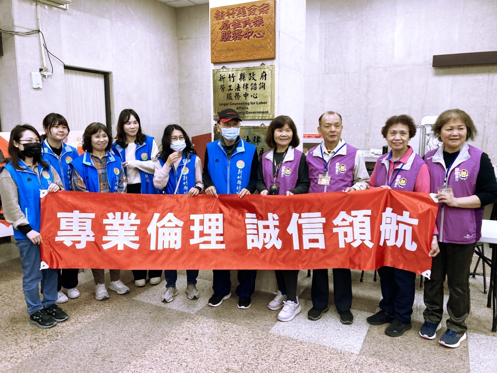 ▲竹縣府政風處結合文化局及消防局等所屬政風機構於春聯揮毫贈送活動現場設置廉政宣導區,透過寓教於樂的方式深化民眾對竹縣府廉能施政的認同與信賴。竹縣府政風處長連心蘭(前排左2)和廉政志工們合影。(圖/竹縣府政風處提供)