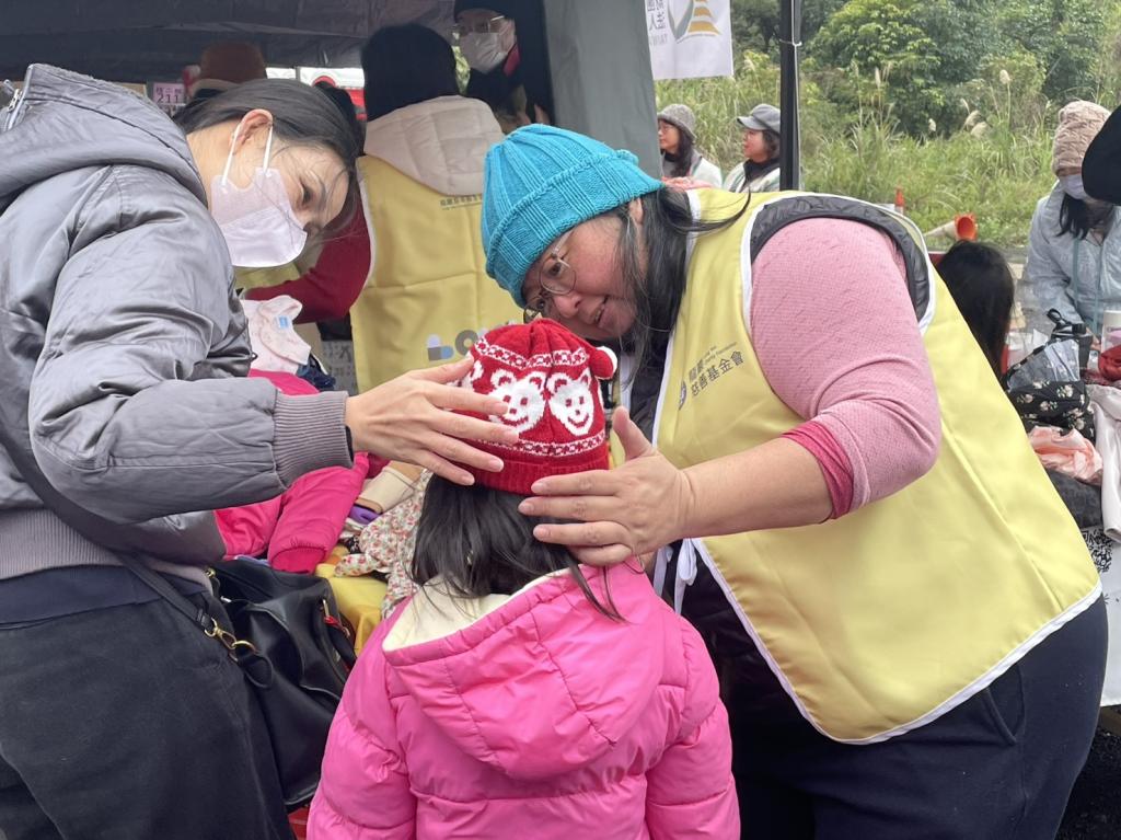 圖說:新北市淡水區關懷弱勢協會串連民間資源捐贈物資和善款,龍巖慈善基金會提供保暖衣物,協助民眾穿戴毛帽。