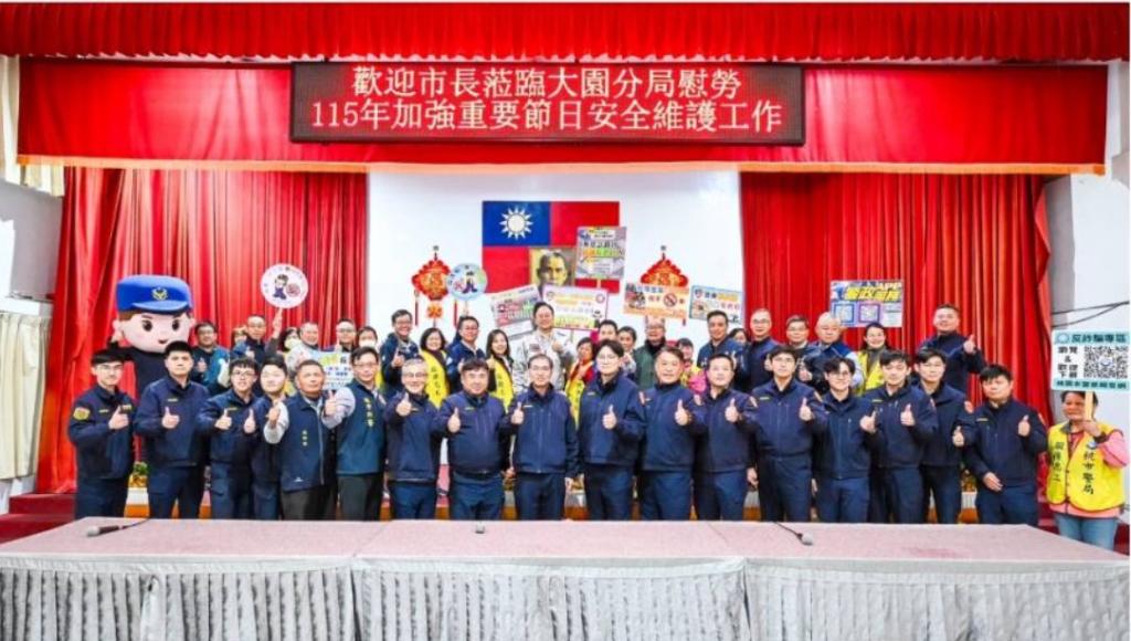 【大成報記者袁慧心/桃園報導】桃園市長張善政今(9)日下午前往龜山分局、蘆竹分局、大園分局、桃園分局及市府警察局,慰勞警察同仁及協勤民力,並頒贈春節慰勞金及慰勞品。張市長表示,春節治安與交通維護工作繁重,感謝警察同仁與協勤民力犧牲假期堅守崗位,全心守護市民平安。市府特於節前致贈慰勞金及慰勞品,向所有投入維護工作的夥伴致上最高敬意。