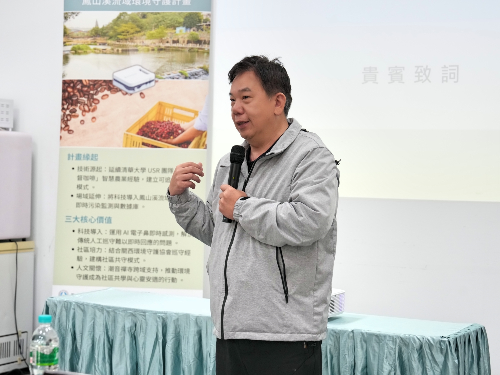 ▲清大USR計畫團隊舉辦「REAL-X電子鼻河川監測平臺」啟動儀式。關西鎮長陳光彩致詞。(圖/清大USR計畫提供)