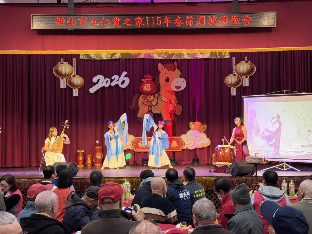 (大成報記者張玉玲/新北報導)新北市立仁愛之家12日舉辦「春節圍爐聯歡會」,邀請院內長者提前共度年節時光。與仁愛之家結緣超過十年的「六合室內樂團」再度到場演出,由黃金蓮老師領軍,攜手戲曲名伶哈憶平、藝人久登、琵琶家陳右家及甜美歌手李淑貞等實力派歌手接力登台,曲目涵蓋傳統戲曲與流行歌曲。
