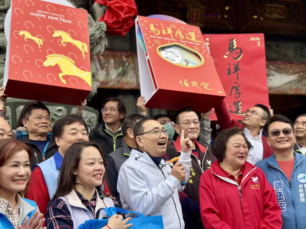 圖說:市長侯友宜大年初三走春祈福,與市民分享馬年福袋「新北轉一圈,馬上賺錢」的吉祥寓意,現場氣氛熱絡。