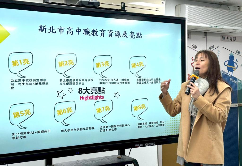 宣導內容除說明新北市高中職「8大教育亮點」,也特別從三個家長最在意的面向切入,實際感受在地就學的優勢。首先,透過實際繁星錄取數據,說明「校校等值」制度,讓家長了解,就讀社區高中,不必追逐名校,也有機會站上校內前段,銜接頂尖大學合作課程。其次,針對偏科表現突出的孩子,結合「AI+數理假日增能方案」與英檢培訓,把每天省下來的通勤時間,轉化為強化學科實力的關鍵優勢。第三,介紹新北公立高中全面推動的「雙聯學制」,讓孩子不出國,也能在熟悉的環境中取得國際文憑,培養未來升學與學習移動的彈性。
