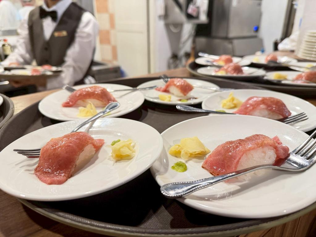 為讓學生將理論轉化為具體味覺記憶,課程也安排專業試吃與料理展示。活動精選近江牛牛小排、翼板、肋眼與沙朗等部位,透過「近江牛牛排」、「特製烤牛肉」、「極品高湯涮牛」與「頂級牛肉壽司」四道料理,呈現不同部位的風味層次。同時融入「泡醬油」與「出汁涮牛」等日本傳統調味手法,展現和牛在不同料理技法中的多元表現,讓學生理解部位特性與和食調味哲學。