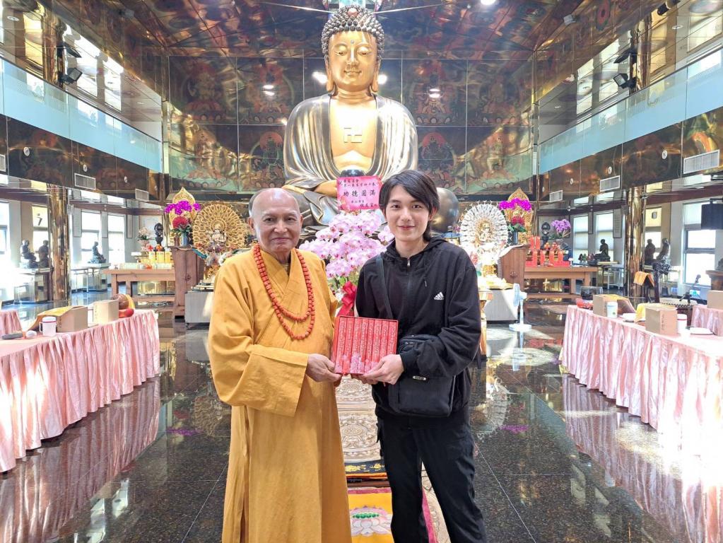 圖說:自閉症畫家魏廷亘專程到三峽普賢寺贈送宗道法師「佛陀與菩提」畫作,以感謝師父的栽培。