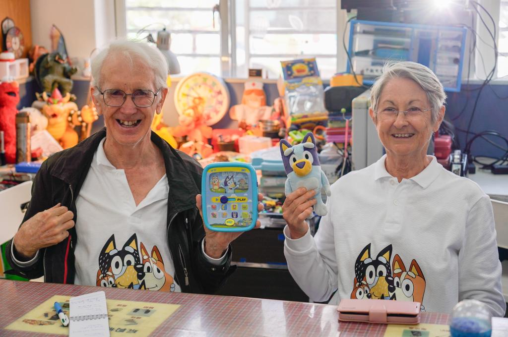 圖說:參訪團Robyn和 Steven Davis夫婦穿著澳洲《妙妙犬布麗》的T恤,新北市玩具銀行LuLu立即找來回收的布麗玩具,令兩人非常的開心。
