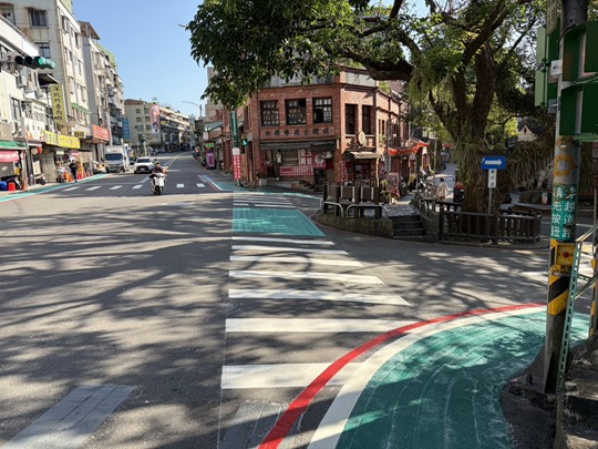 圖說:深坑老街口增設行人穿越道,並在轉角設置了行人等候空間。