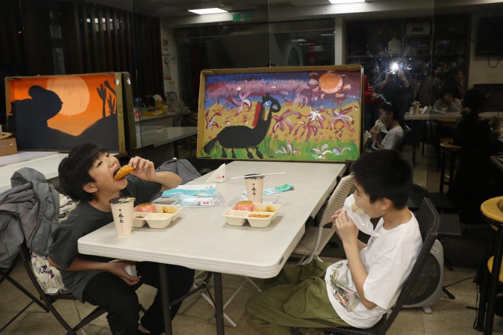 圖說:小衛星兒少在捐贈後,迫不及待打開餐盒,大快朵頤。