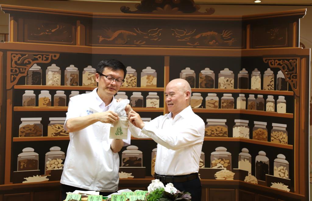 圖說:教育局長張明文與永和「順安堂蔘藥行」負責人邱錦章現場示範中藥防蚊包手作體驗。