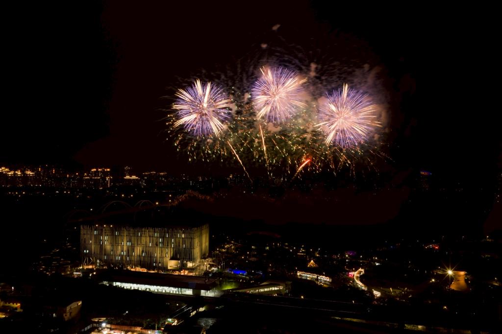 圖說:新北市美術館開館周年活動壓軸煙火展演登場,璀璨煙火於夜空綻放,點亮三鶯地區。