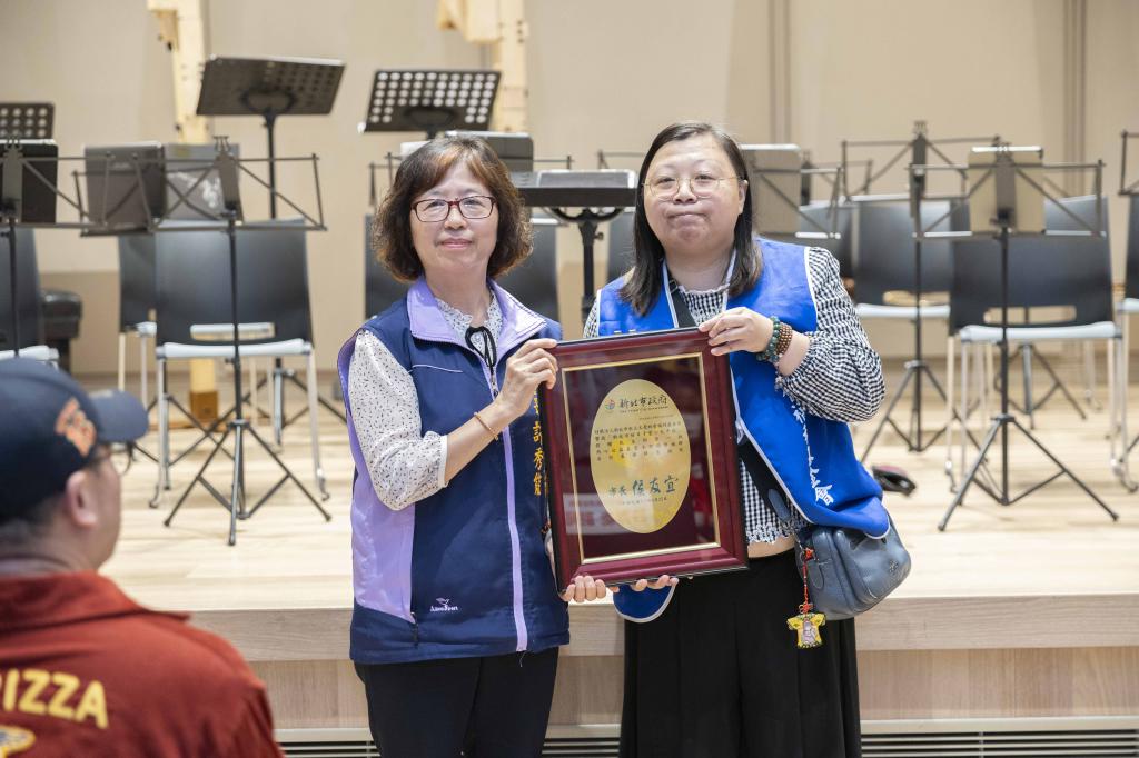 圖說:社會局副局長許秀能代表侯友宜市長致贈感謝牌給財團法人新北市私立文豪社會福利基金會代表林映如(右)。