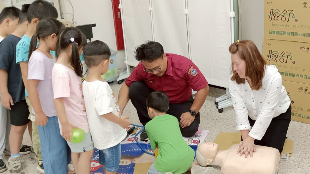 活動內容規劃多元且具臨場感,首先登場的是防火避難宣導,藉由濃煙屋情境模擬,引導孩童學習正確的逃生技巧與應變方式;接續進行消防衣著裝與射水體驗,小朋友換上專屬消防服,親自操作水線設備,體驗第一線救災的實際情境,加深對消防工作的理解。最後安排CPR教學與實作演練,讓家長與孩子一同學習基本急救技能,提升面對突發狀況時的應變能力與自救互救意識。
