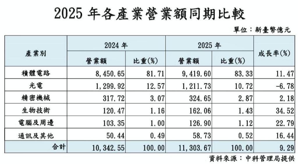 就園區主要產業分析,受惠於AI應用需求強勁及高頻寬記憶體需求,其中,積體電路營業額成長11.47%;光電產業面板因市場需求轉弱及價格下滑,致營業額微幅衰退6.78%;精密機械產業因半導體擴廠布局先進製程,帶動設備需求增加,營業額成長2.18%;電腦及周邊產業受惠指紋識別模組需求增加,營業額成長22.79%;生技產業因新藥需求增長及行銷策略優化,營業額大幅揚升34.52%。