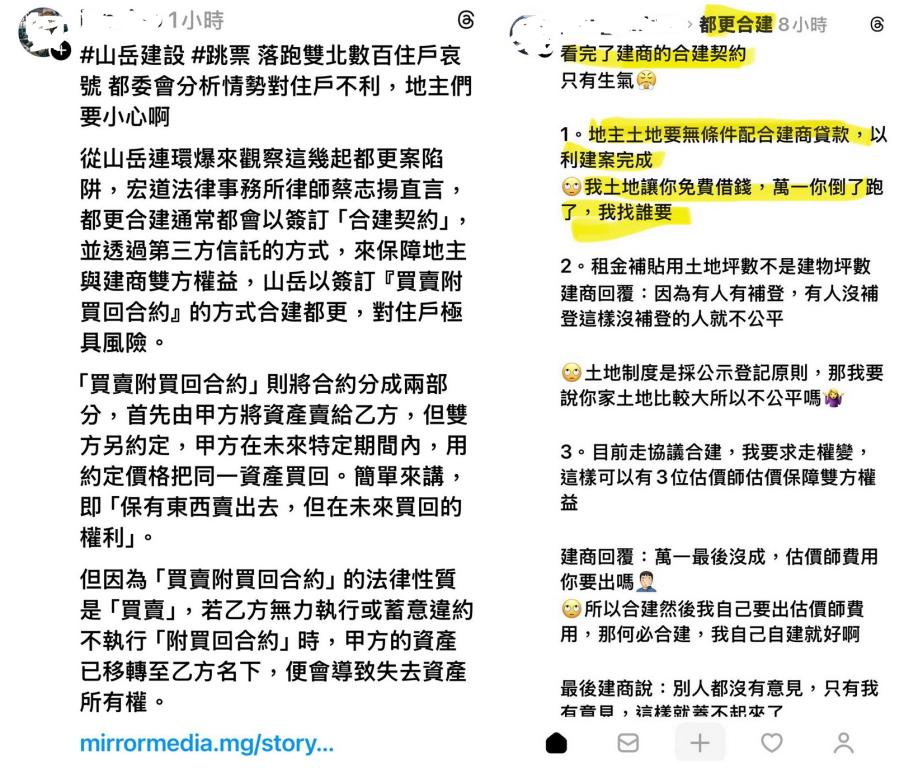 更值得警惕的是,這樣的安排往往被包裝為「都更慣例」、「銀行要求」、「不這樣做案子走不下去」。在資訊與專業極度不對等的情況下,多數住戶其實沒有真正的選擇權,只能在「不同風險版本」中,被迫選擇一條看似能前進的路。